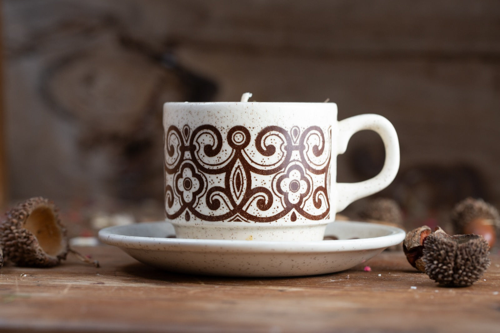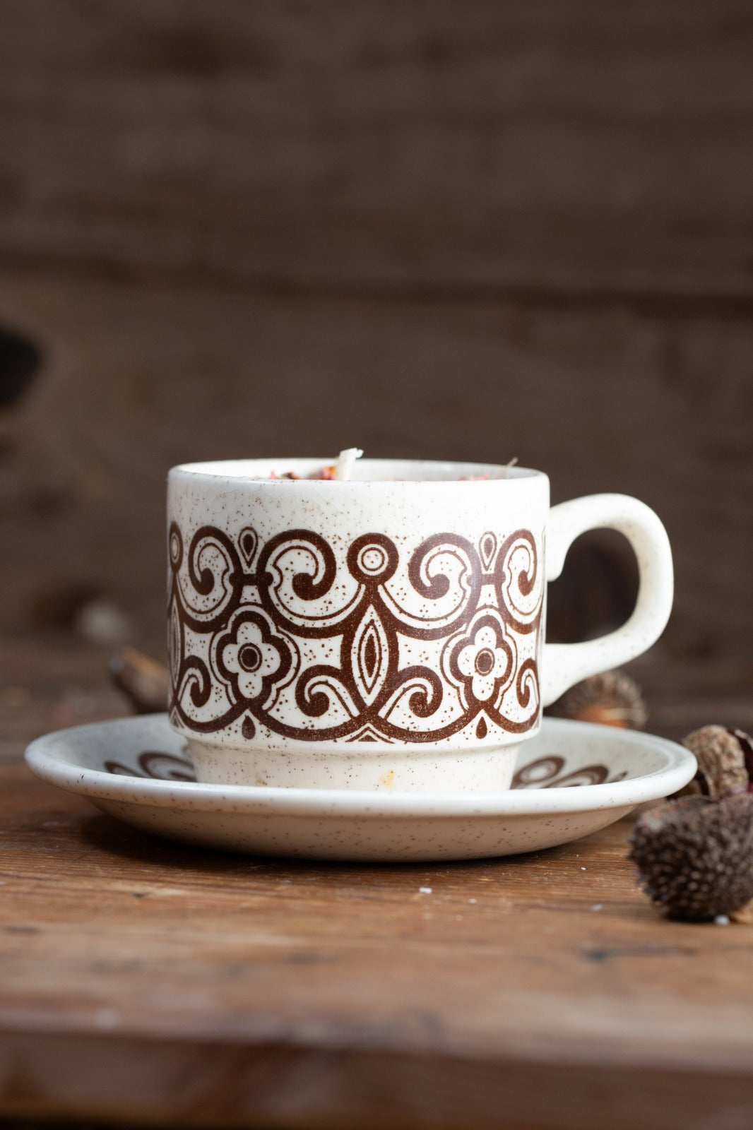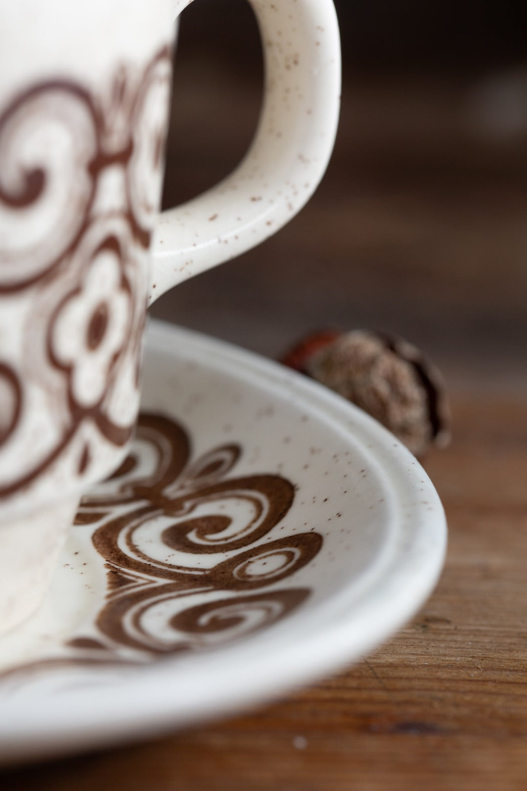עיטור: דוגמה גרפית גיאומטרית בצבע חום כהה – הדפס מתגלגל (transfer print) בסגנון מודרני של שנות ה־60–70, המשלב קווים סימטריים ואלמנטים פרחוניים.