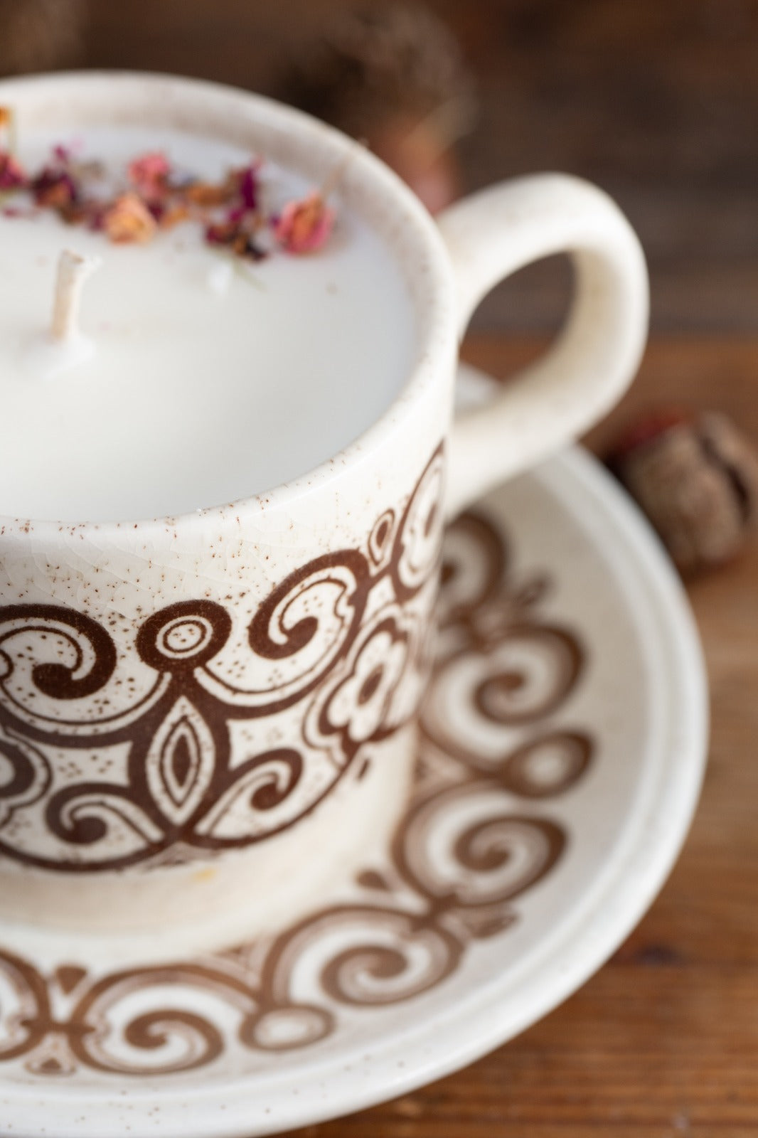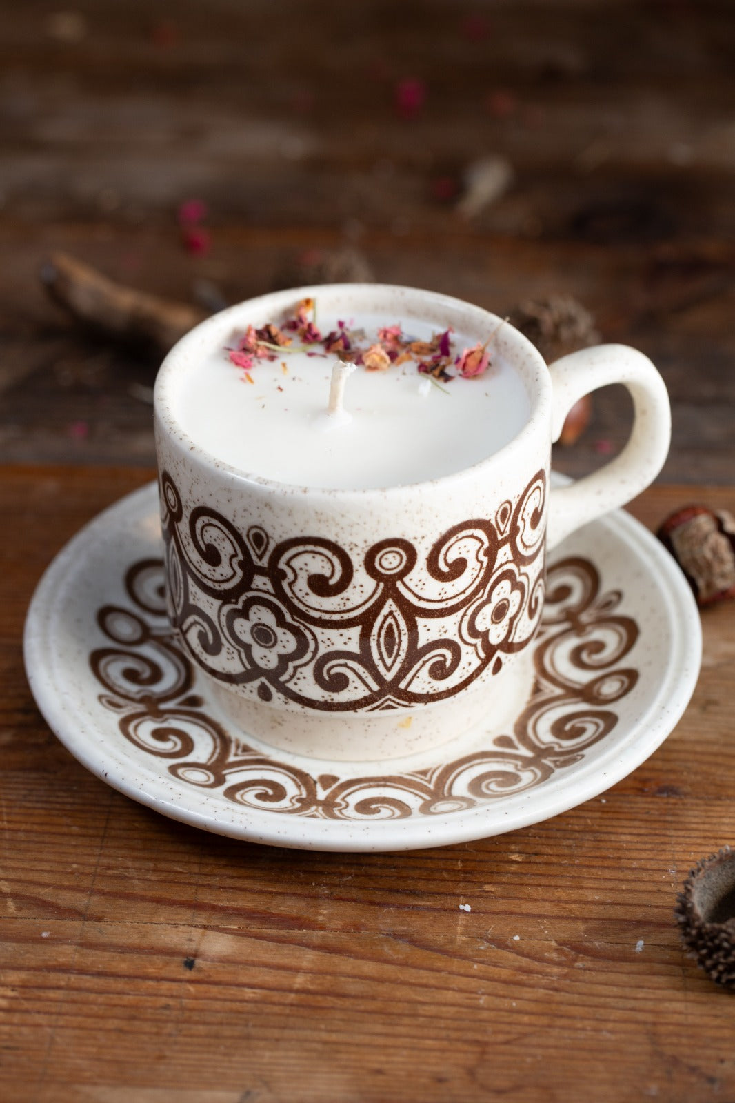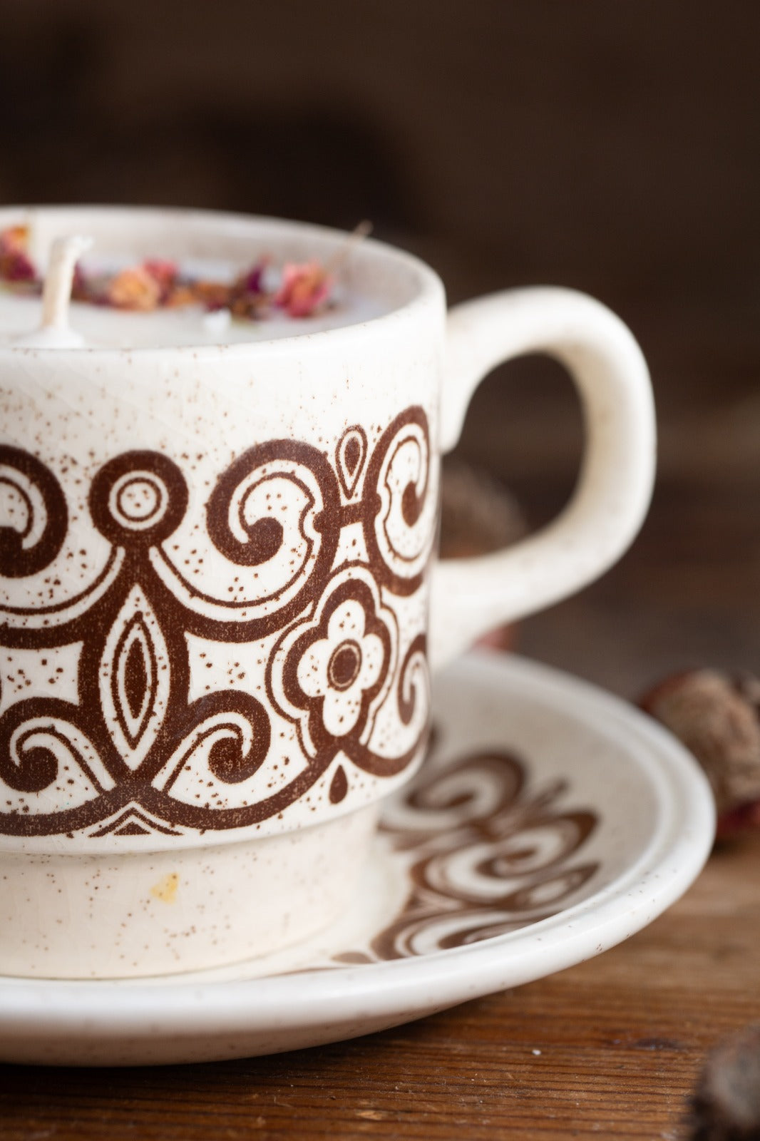 סט וינטג’ אנגלי של ספל ותחתית מבית Biltons England, אחת היצרניות הידועות של כלי חרס בעבודת יד שפעלה באנגליה מאמצע המאה ה־20 ועד שנות ה־80.