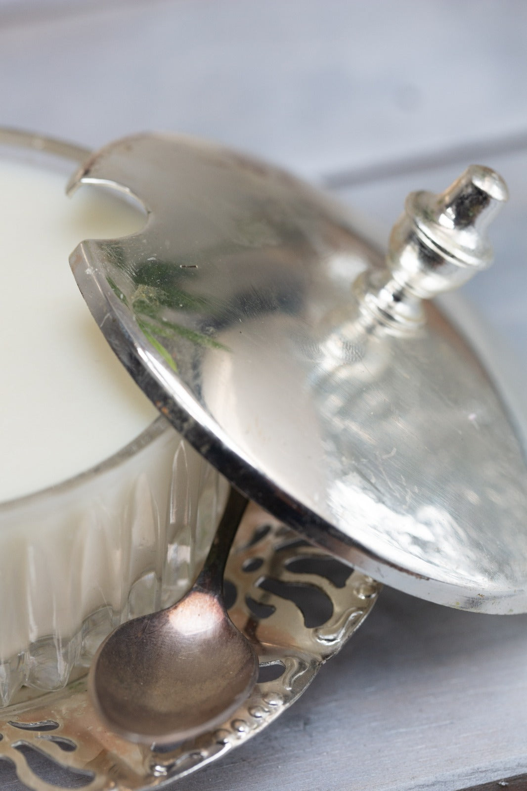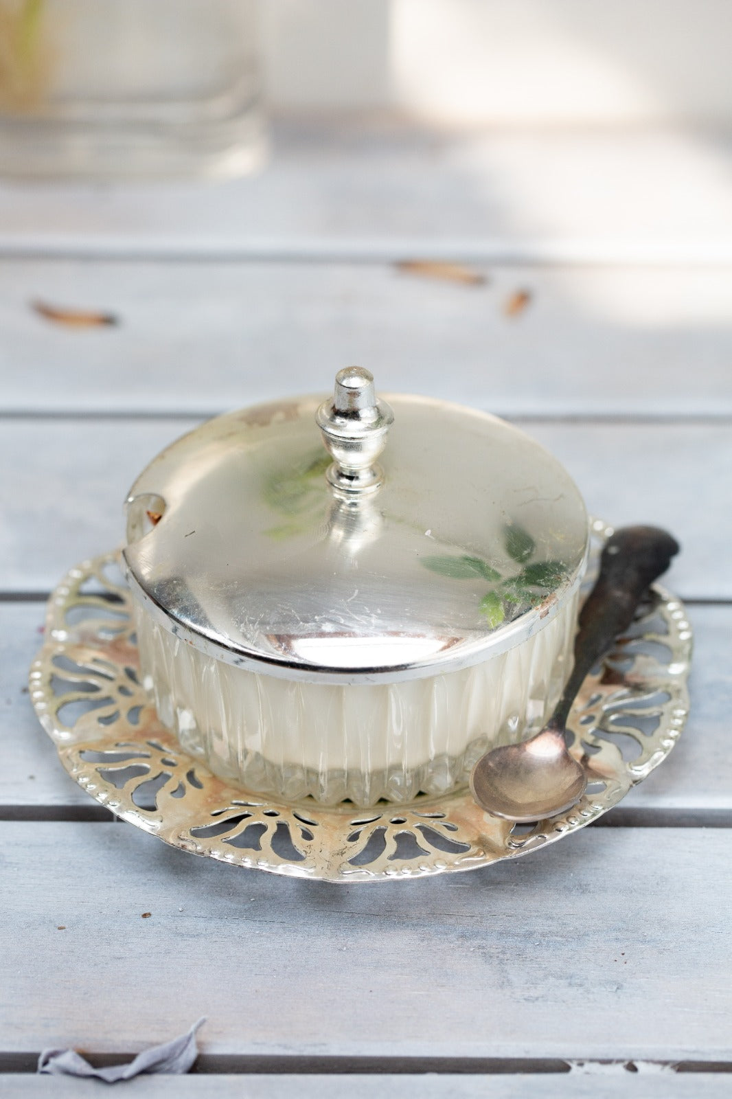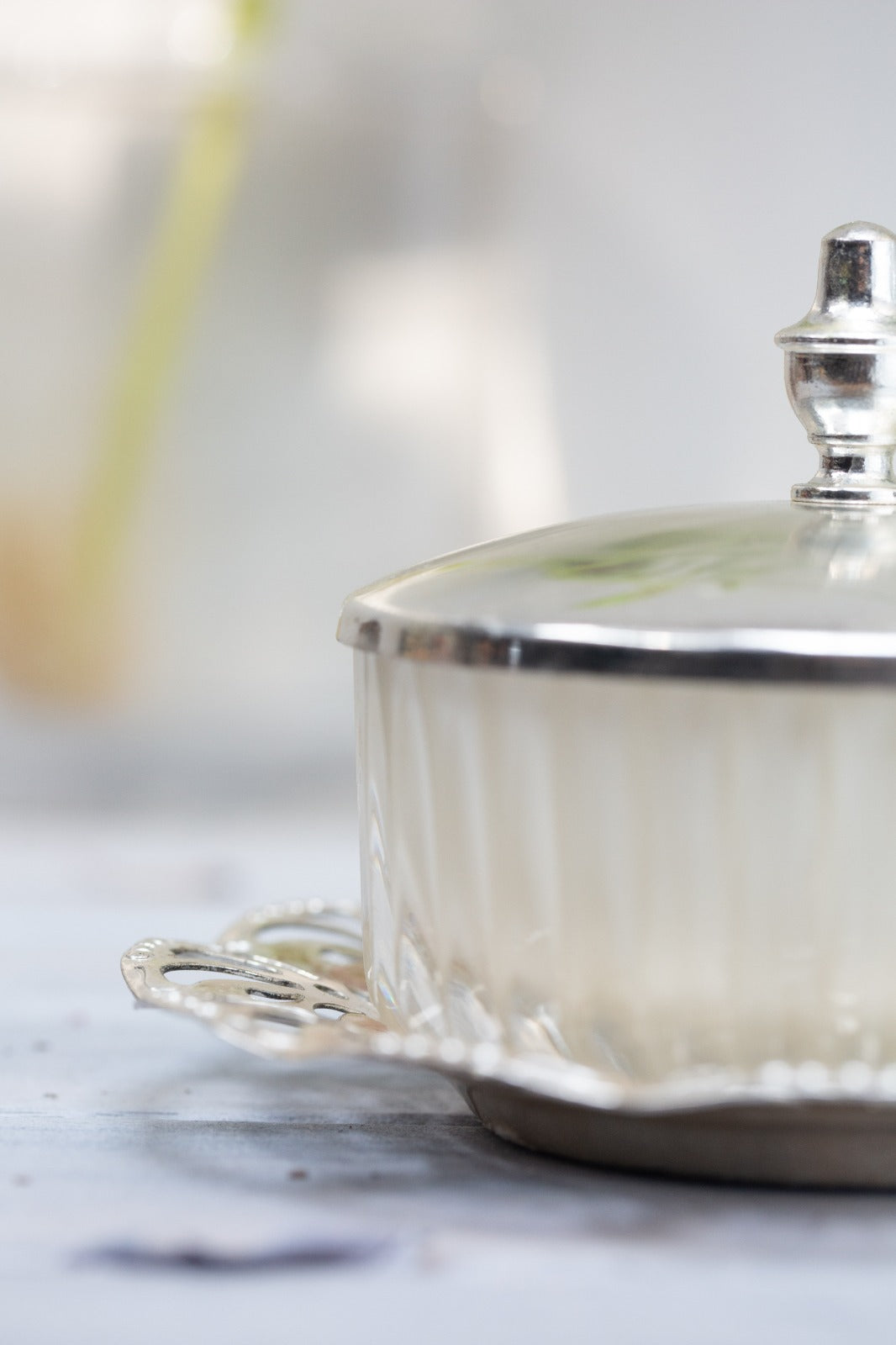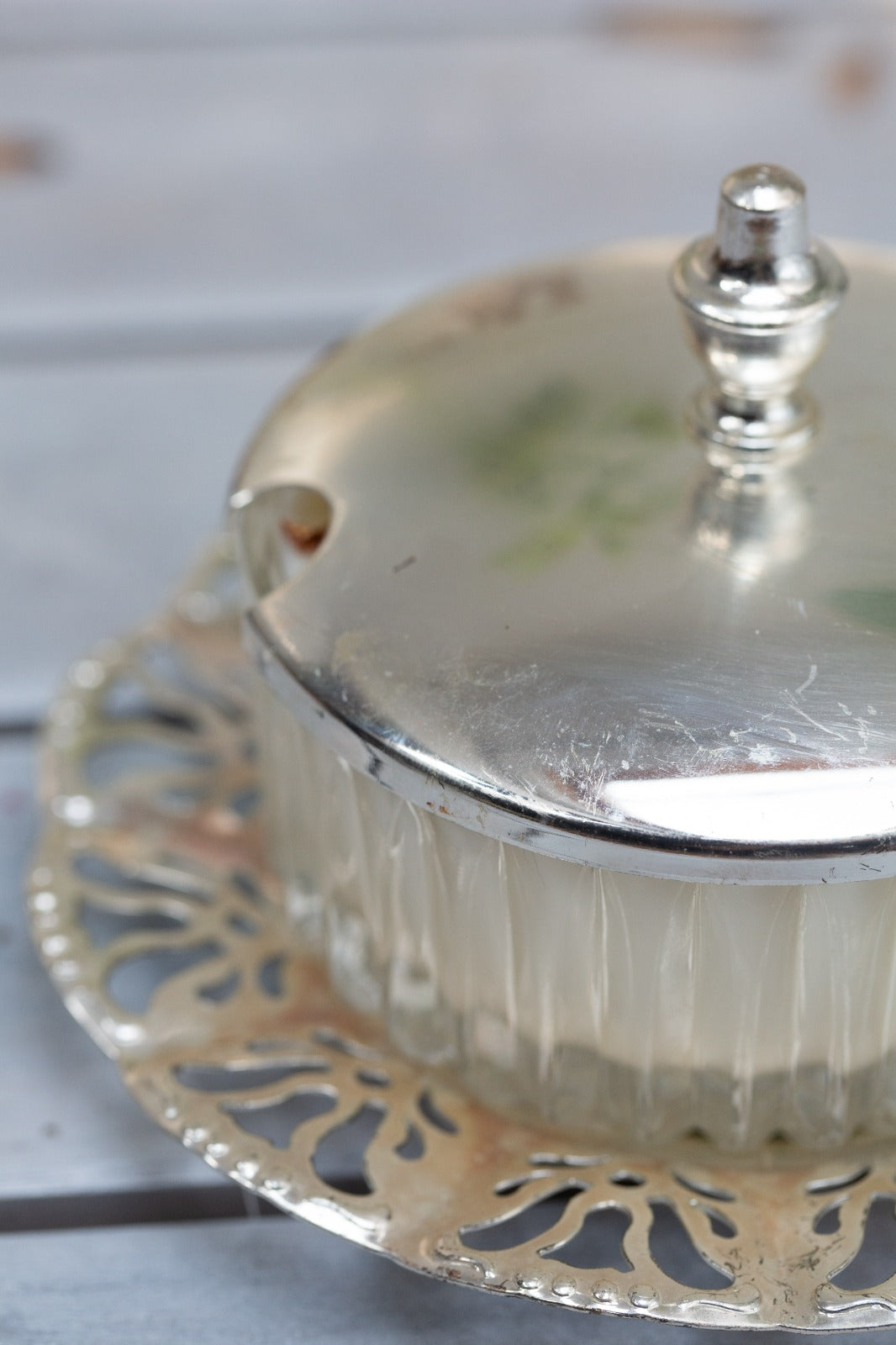 קערת זכוכית עם מכסה וציפוי כסף ככל הנראה משנות ה־1950 שיוצרה באירופה כלי מועדף בבתי מלון ובבתים בורגניים באירופה בשנות ה־60.