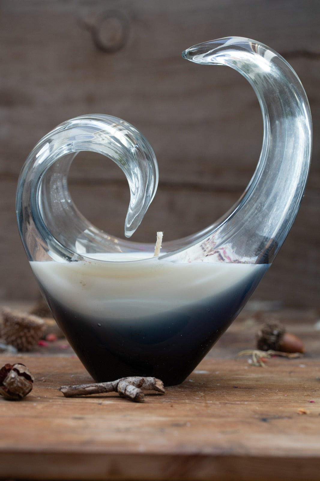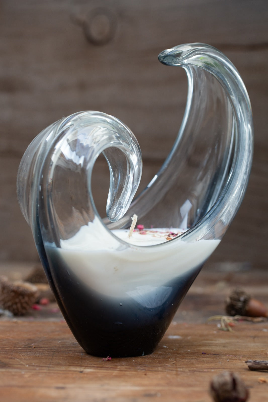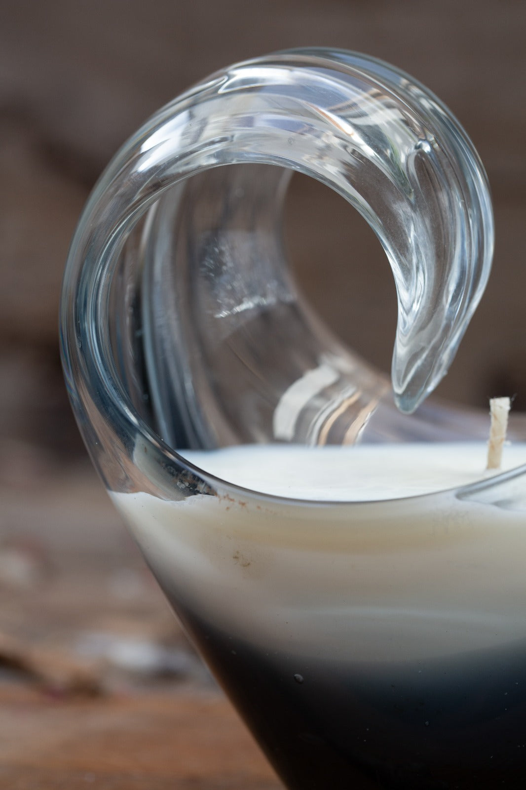 העיצוב המעוקל והזורם, המזכיר גל ים או להבת זכוכית, נוצר בטכניקת Sommerso המזוהה עם אמני מוראנו שבאיטליה - שכבות זכוכית שקופות וכהות הנפגשות ליצירת עומק וצבע משתנים באור.