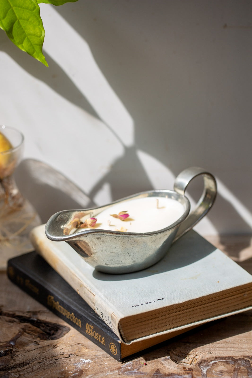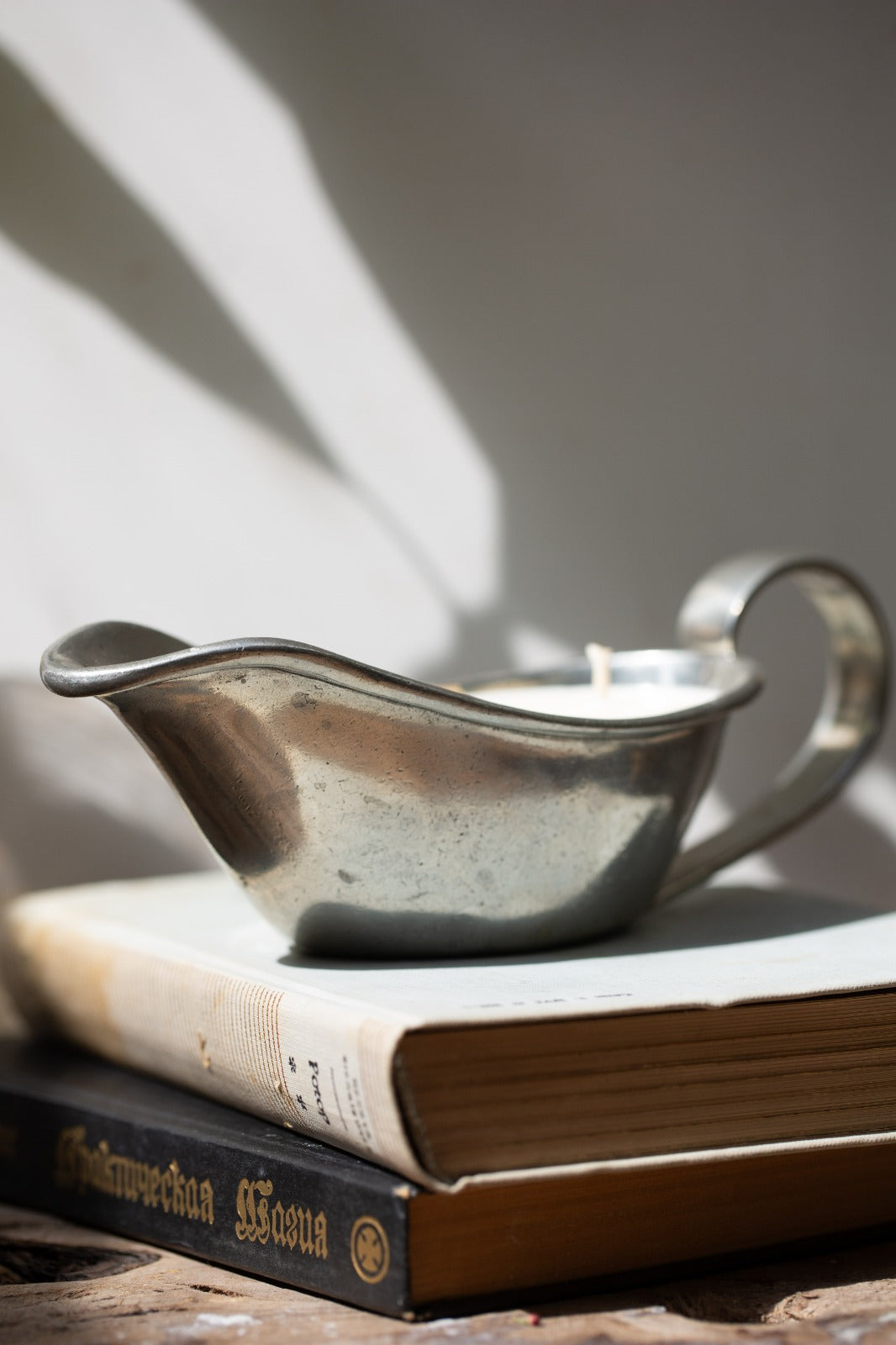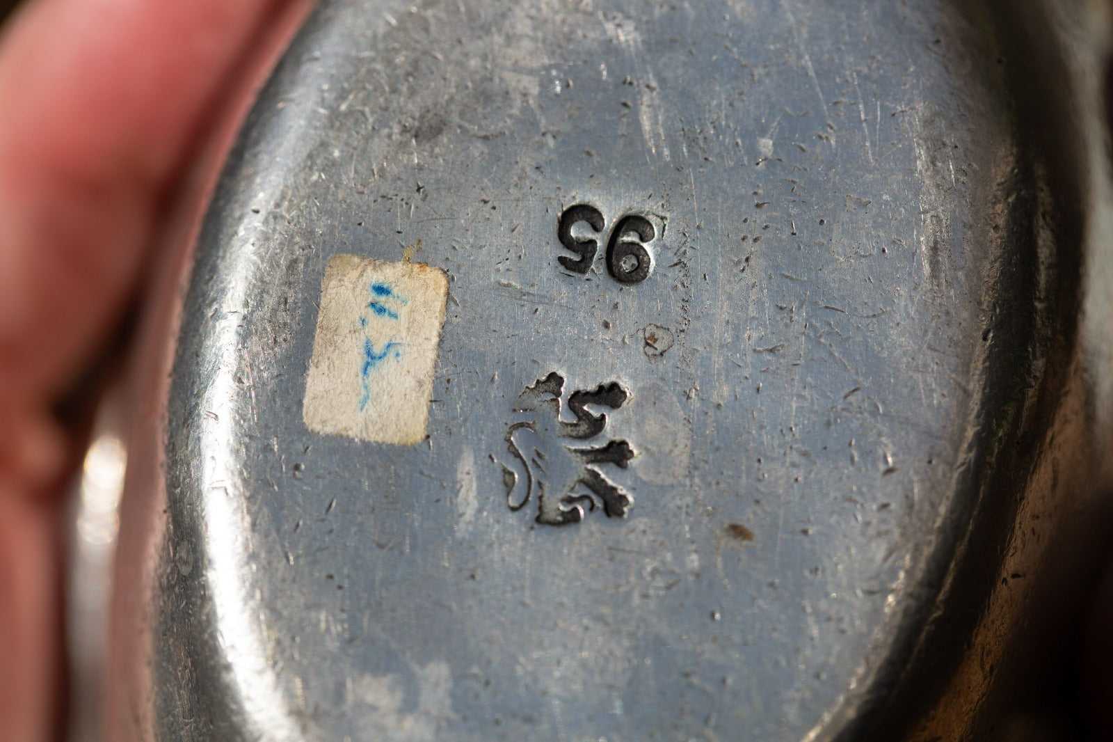 כלי לרוטב, עשוי פיוטר , בעל גוף מוארך עם זרבובית משוכה וידית טבעתית אחורית – צורה קלאסית לשירות רטבים חמים בארוחות רשמיות. סימון התחתית כולל את הספרה “95” וסמל אריה בסגנון הרלדי, חותמת אופיינית ליצרני פיוטר גרמניים או סקנדינביים מהמאה ה־20, כאשר המספר מציין לרוב דרגת סגסוגת או קוד דגם ולא טוהר כסף. איכות היציקה האחידה, הדופן הדקה יחסית והפטינה האפרפרה הטבעית מצביעים על ייצור תעשייתי מערב־אירופי משנות ה־50–70 של המאה ה־20, תקופה שבה כלי פיוטר חזרו לאופנה בעיצוב מודרניסטי נקי בהשראה מסורתית