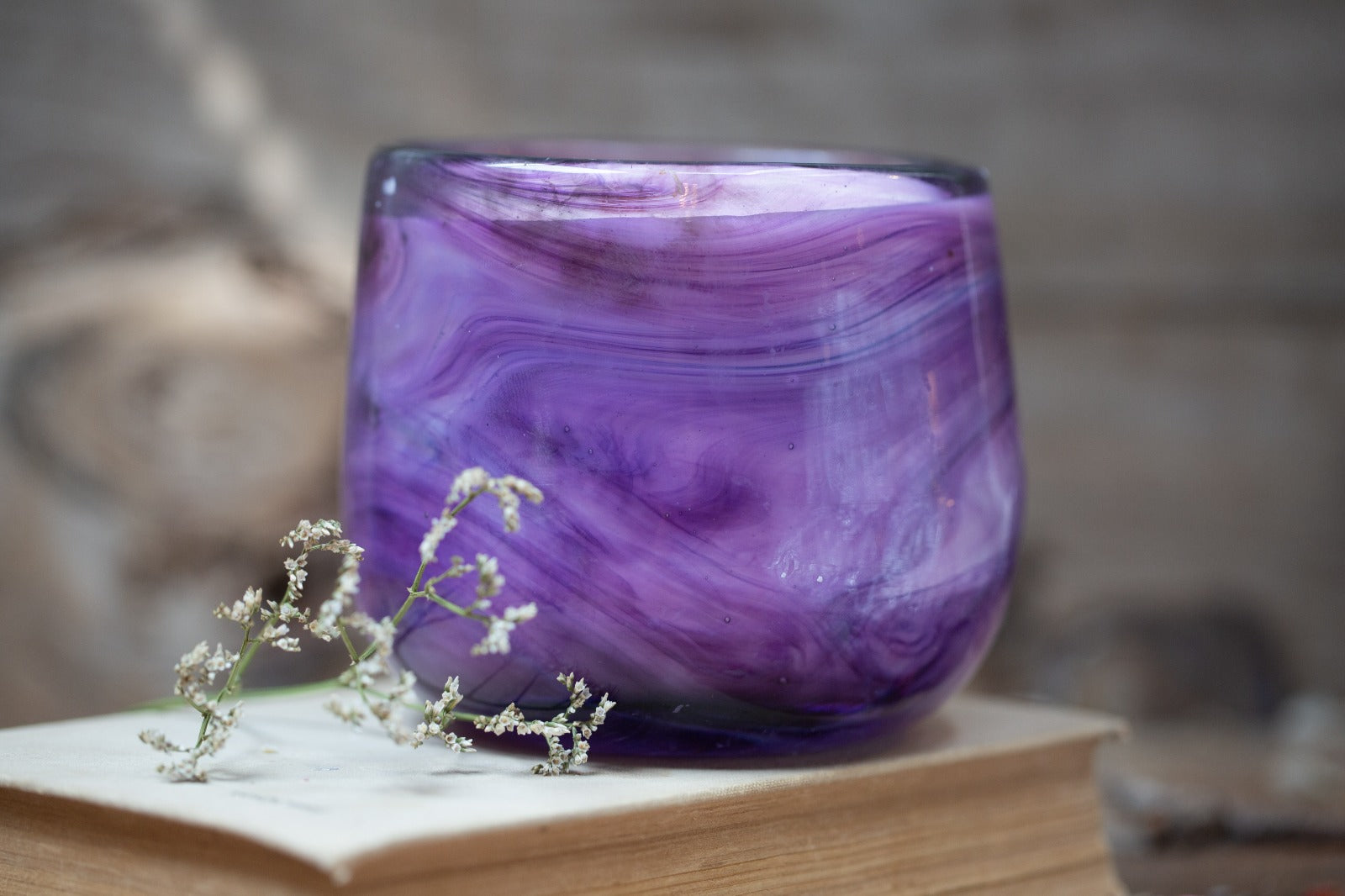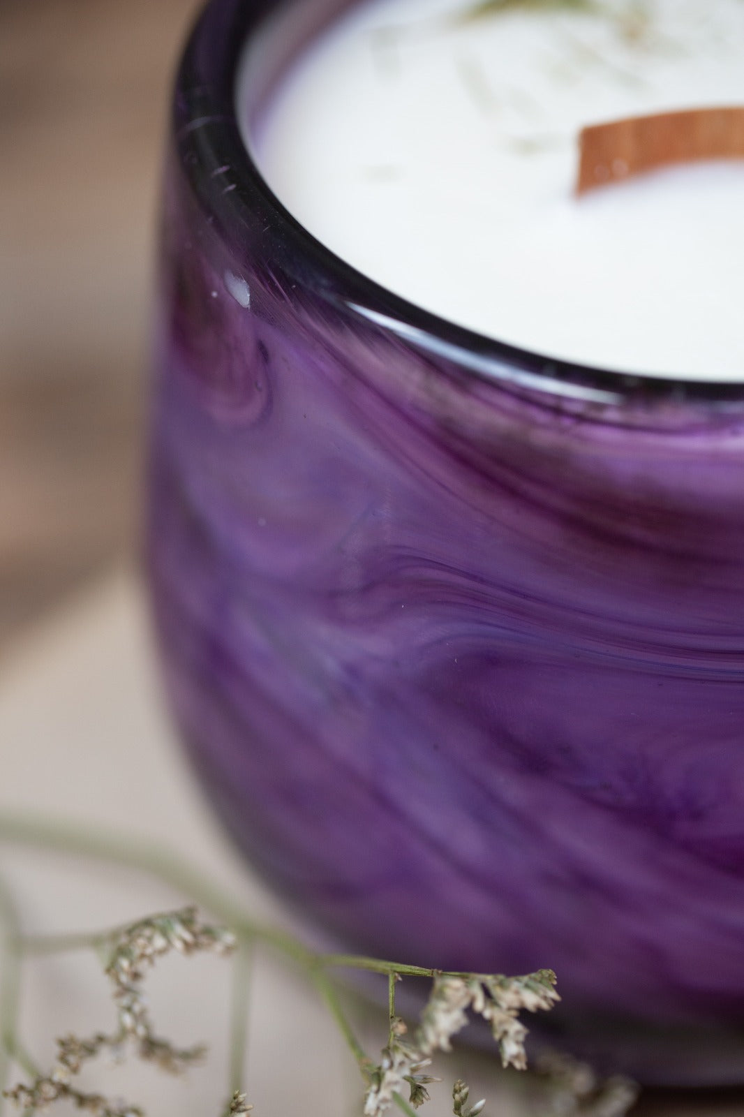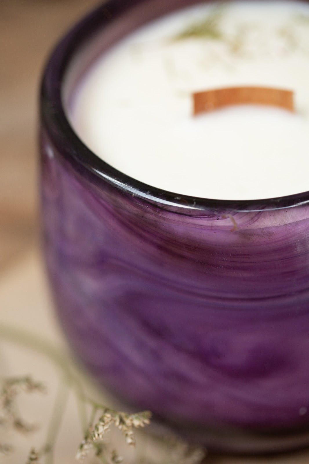 נר חד פעמי, יצוק לכלי עגול עשוי זכוכית סגולה,   הזכוכית עצמה בגוון סגלגל עם נימים בצבעים עדינים , עם שקיפות.
