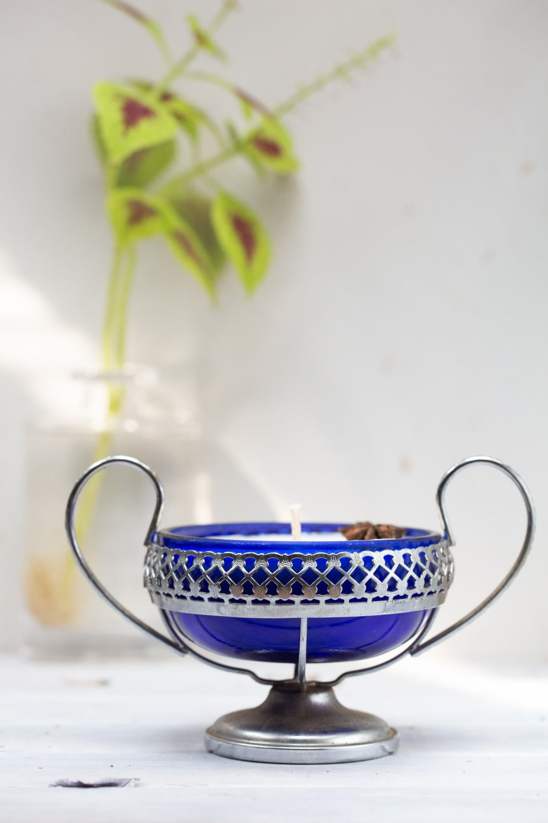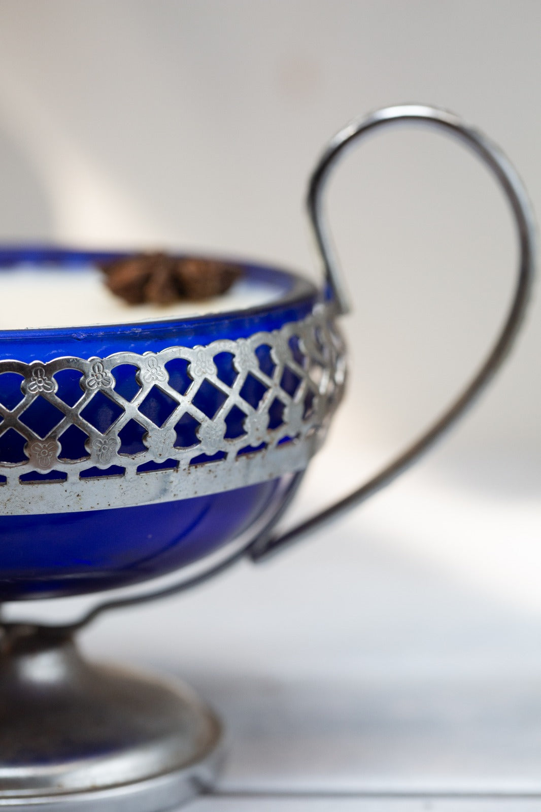 סלסלת תחרה כסף מצופה וקערית כחולה.
