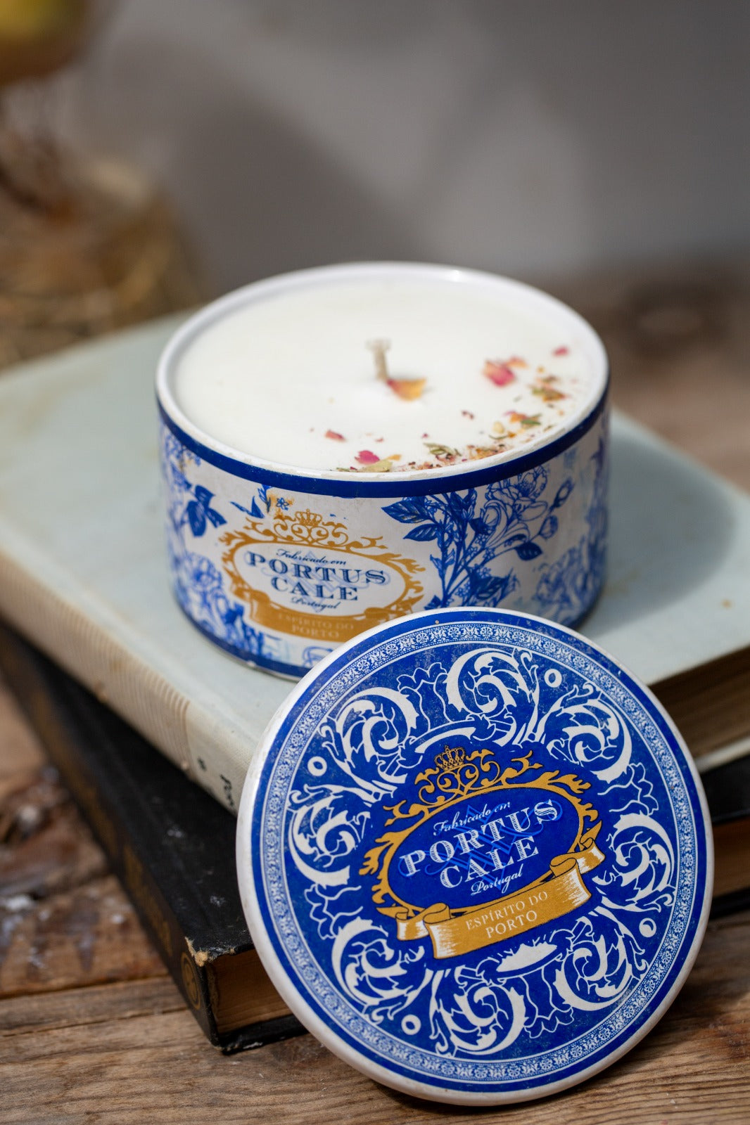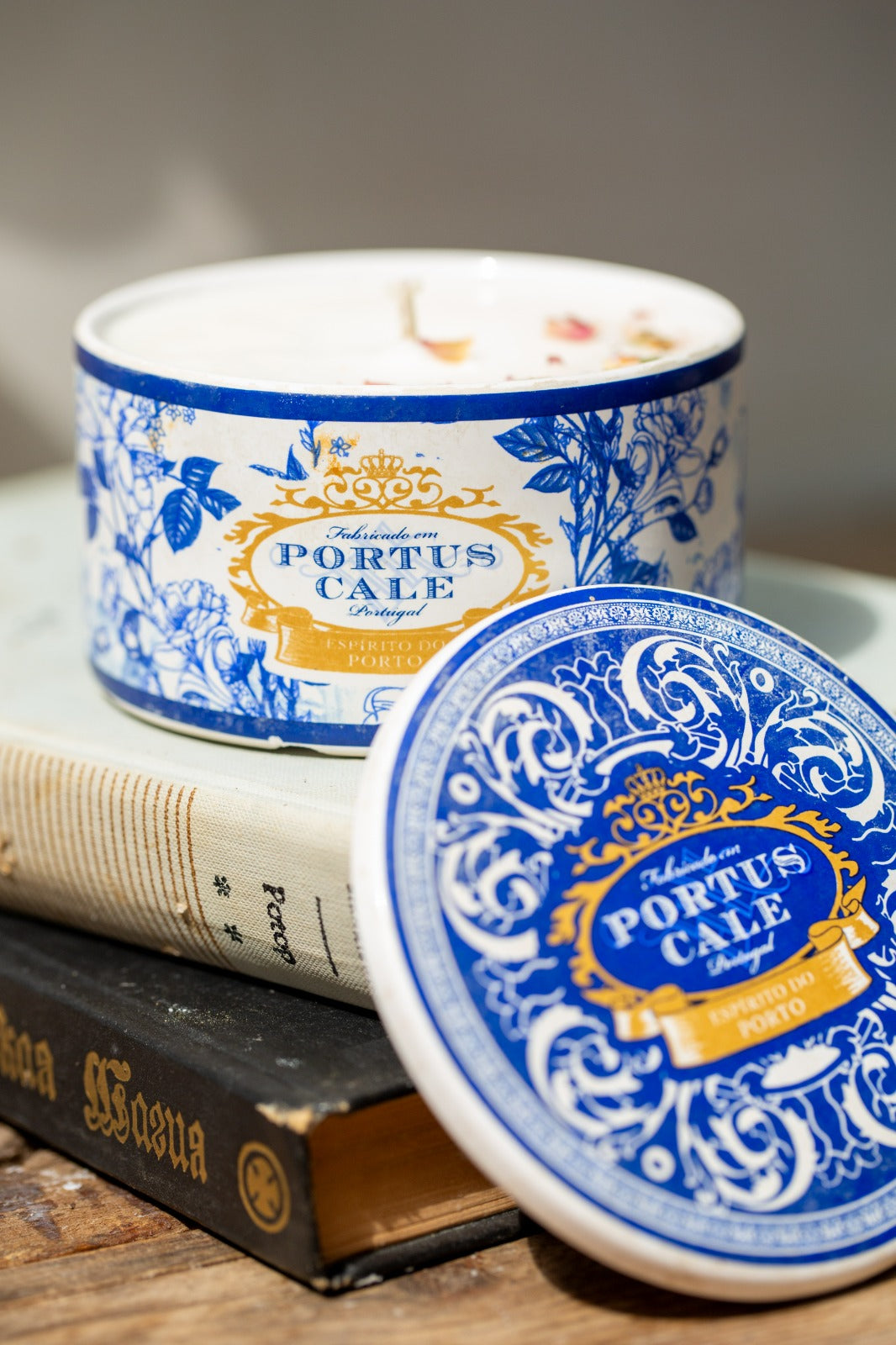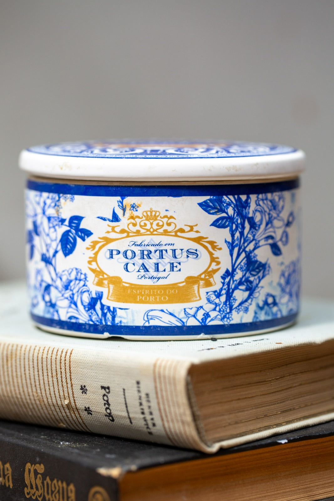 קופסת קרמיקה עגולה עם מכסה מתוצרת המותג הפורטוגלי Portus Cale, המיוצרת בפורטוגל ומעוטרת בהשראת מסורת האזולז’וש (Azulejos) – אריחי הקרמיקה הכחולים-לבנים האופייניים לאמנות הדקורטיבית של פורטוגל. על פי החותמת בתחתית (Exclusively Handmade for Castelbel – Portus Cale Portugal) מדובר בפריט שיוצר עבור חברת Castelbel, יצרנית פורטוגלית ידועה של מוצרי ריח ואירוח ביתי. הקופסה עשויה קרמיקה מזוגגת לבנה עם הדפס דקורטיבי בגווני כחול קובלט וזהב המדמה סגנון קלאסי פורטוגלי עם מסגרות בארוקיות ועיטורי צמחייה, כאשר המכסה מעוטר באותו דגם. פריטים מסוג זה מיוצרים לרוב במפעלי קרמיקה באזור פורטו ומשמשים ככלי אחסון דקורטיבי או ככלי לנר ריחני, כפי שנראה כאן. מבחינת תקופה מדובר בפריט עכשווי-דקורטיבי מתחילת המאה ה-21 (בקירוב משנות 2000 ואילך), המשחזר באופן מודרני מוטיבים מסורתיים של הקרמיקה הפורטוגלית הקלאסית.