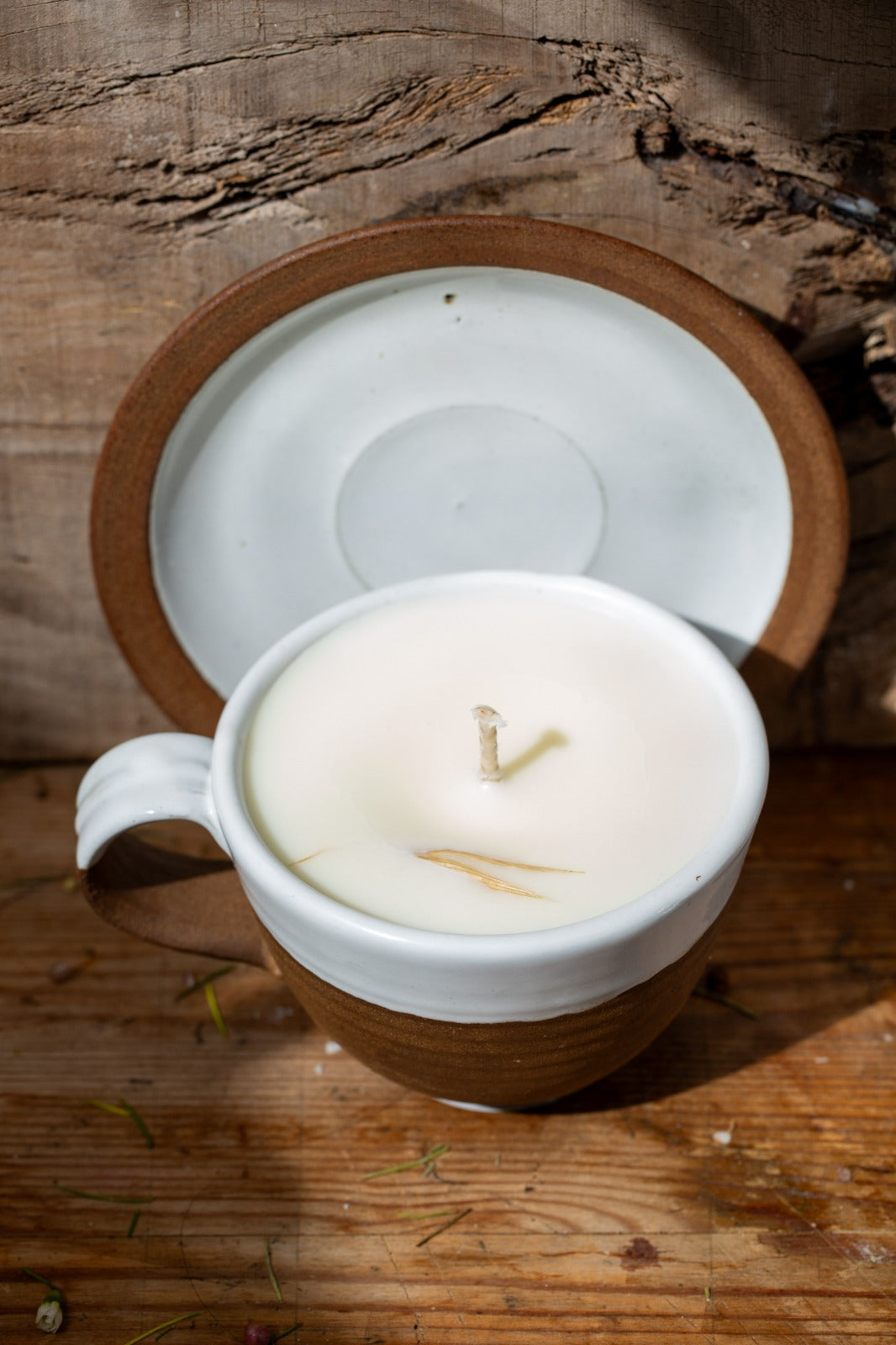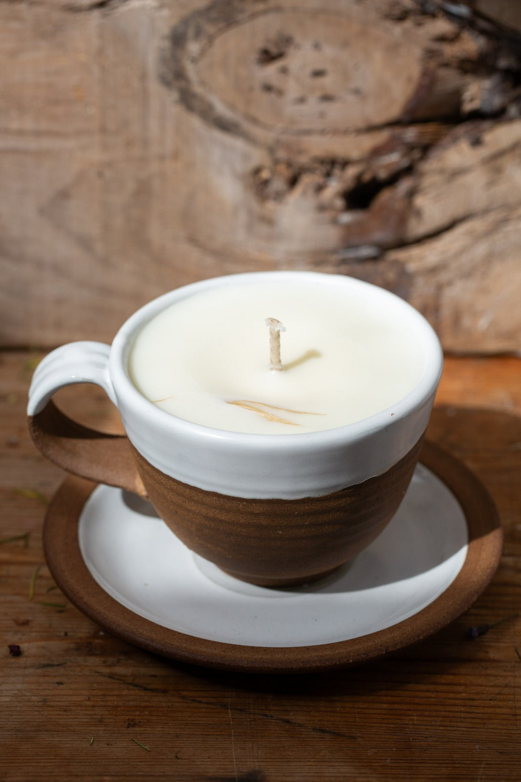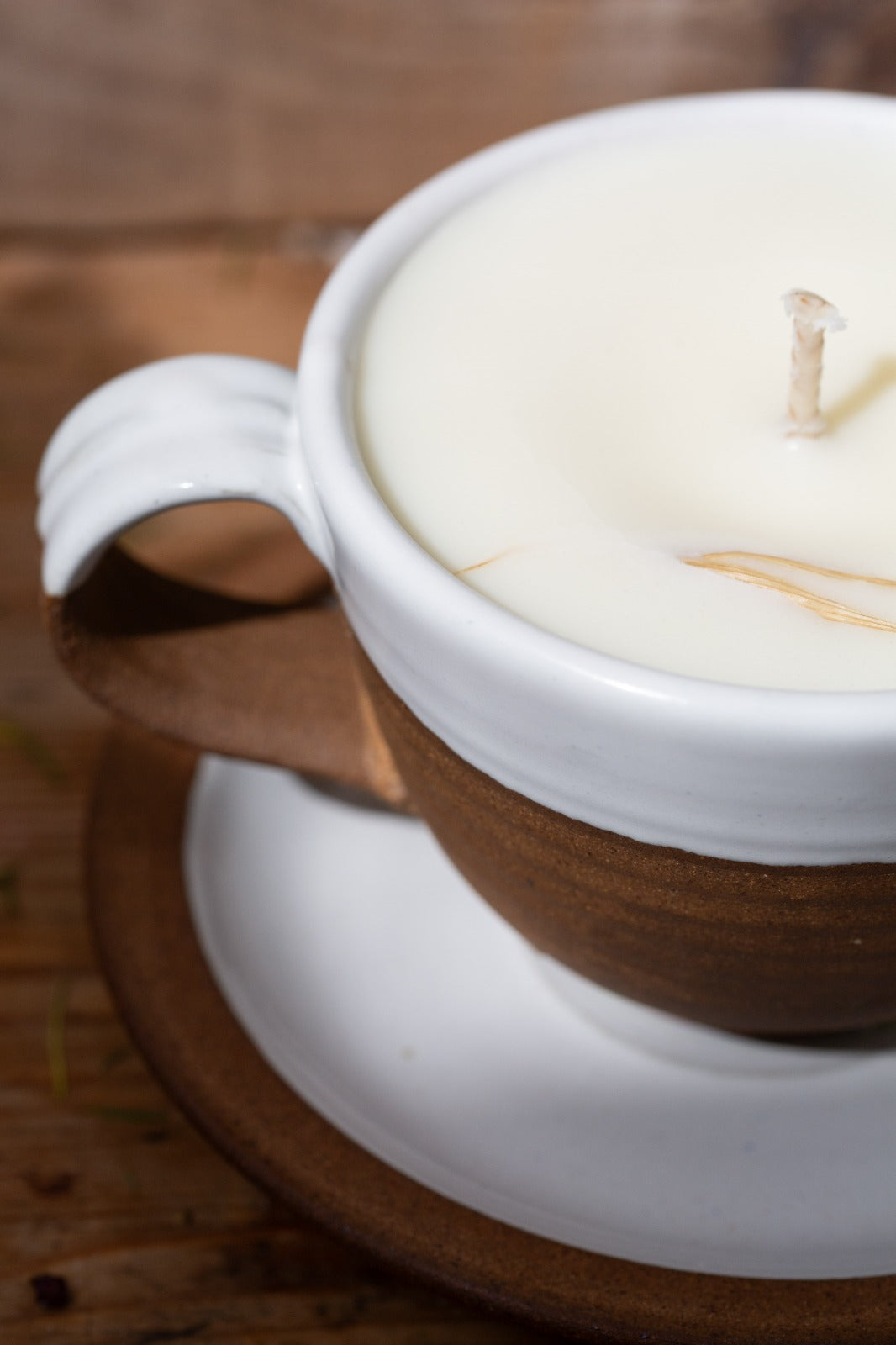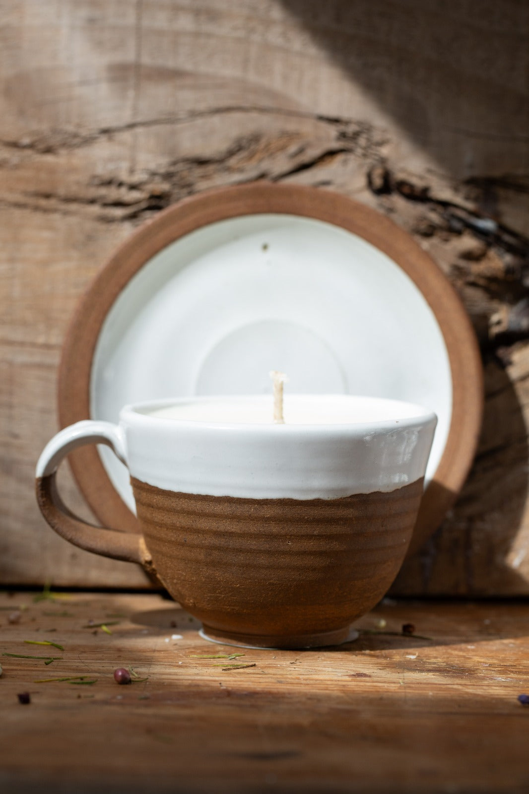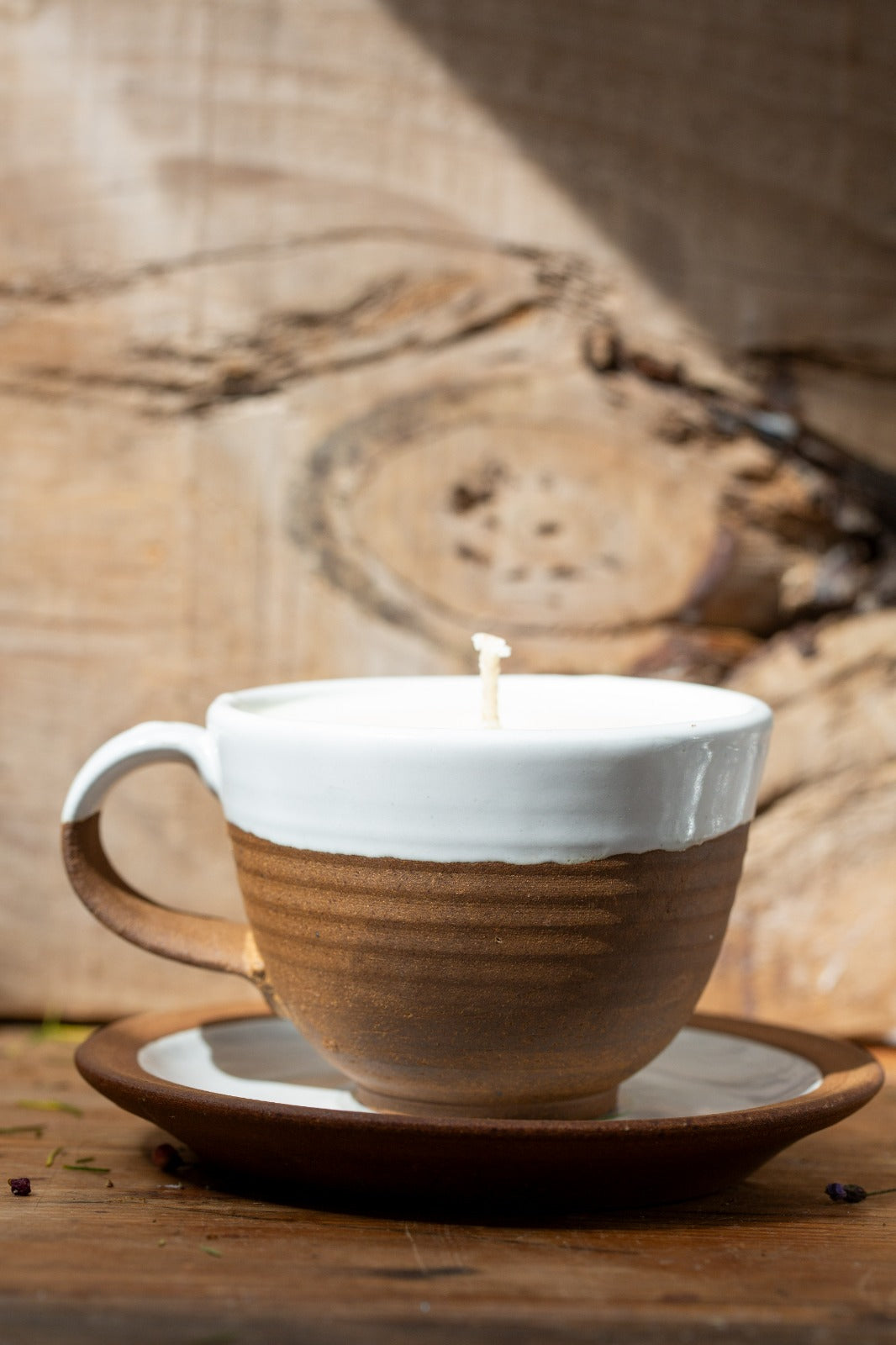 כוס תה/קפה עם תחתית מקרמיקת סטונוור (stoneware) שנוצרה בעבודת גלגל או בתבנית עם עיבוד ידני, מאופיינת בשילוב טיפוסי של גוף חרס בגוון חום טבעי עם זיגוג לבן אטום בשפת הכלי ובפנים הכוס. המרקם המחורץ בגוף החיצוני והניגוד בין החלק הבלתי מזוגג יחסית לבין הזיגוג הלבן הם מאפיינים בולטים של כלי סטונוור בסגנון סטודיו-פוטריז או ייצור סקנדינבי/צפון-אירופי שהושפע מאסתטיקת העיצוב הפונקציונלי של אמצע המאה ה-20. סגנון זה היה נפוץ במיוחד במפעלי קרמיקה בדנמרק, גרמניה המערבית והולנד, וכן בסדנאות קרמיקה אומנותיות, שם הודגש המראה הטבעי של החומר והגלזורה הפשוטה.