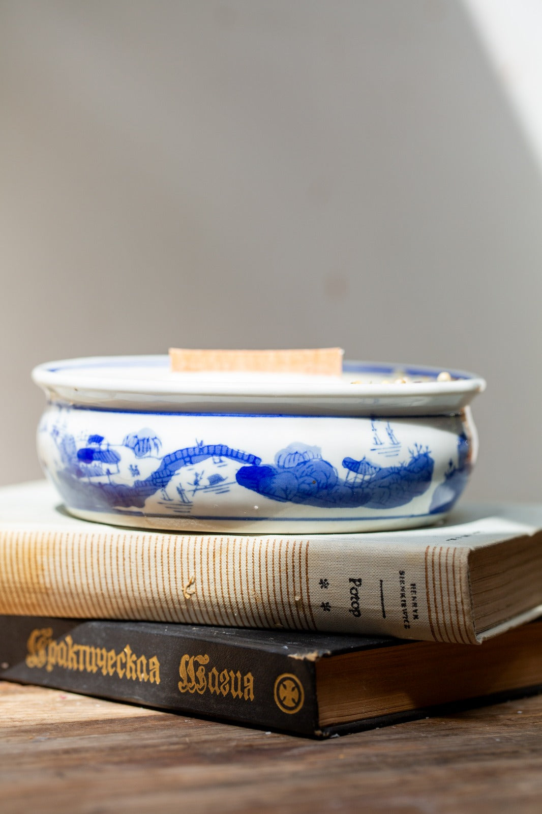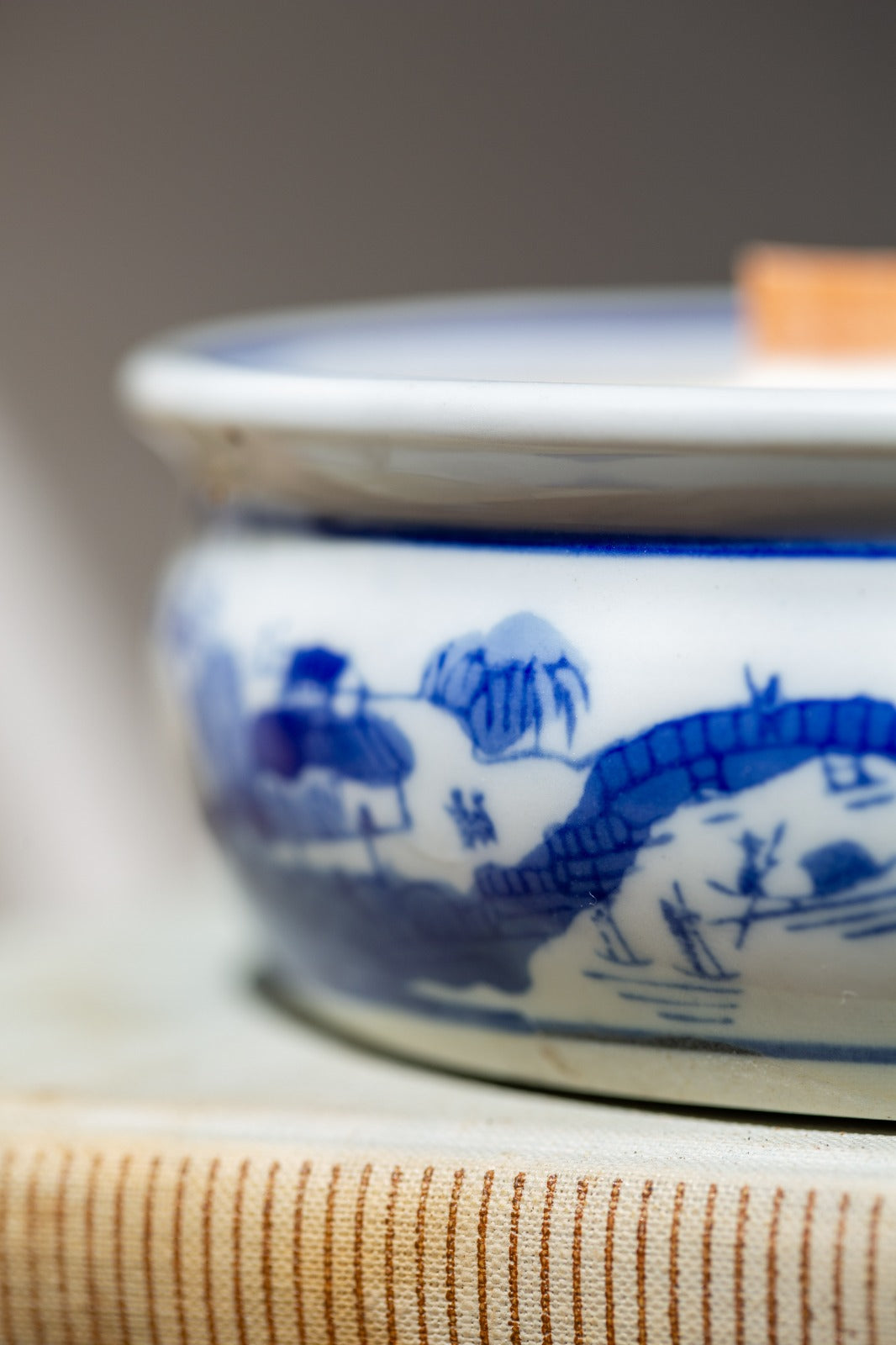 קערת פורצלן נמוכה מעוטרת בעיטור כחול-לבן בסגנון Chinoiserie, ציור נוף סיני מסורתי הכולל גשר אבן מקושת, עצים ודמויות קטנות – מוטיבים שנפוצו מאוד בכלי פורצלן שיוצרו באירופה בהשראת הפורצלן הסיני. הגוף עשוי פורצלן לבן דק עם זיגוג מבריק, ועל הדופן מצוירת סצנה רציפה בצבע קובלט תחת הזיגוג, טכניקה אופיינית למסורת הקרויה Blue and White porcelain. הצורה הנמוכה עם השפה המעוגלת מצביעה על כלי ששימש במקור ככלי הגשה לעיתים כקערת מרק. על-פי סגנון הציור, עובי הדופן והעיבוד, סביר שמדובר בייצור אירופי או יפני שנועד לייצוא, מתקופה של אמצע המאה ה-20 (בערך שנות 1940–1970), כאשר מפעלים רבים באירופה וביפן ייצרו כלים בסגנון “Willow” או נופי גשר סיניים עבור שוקי המערב.