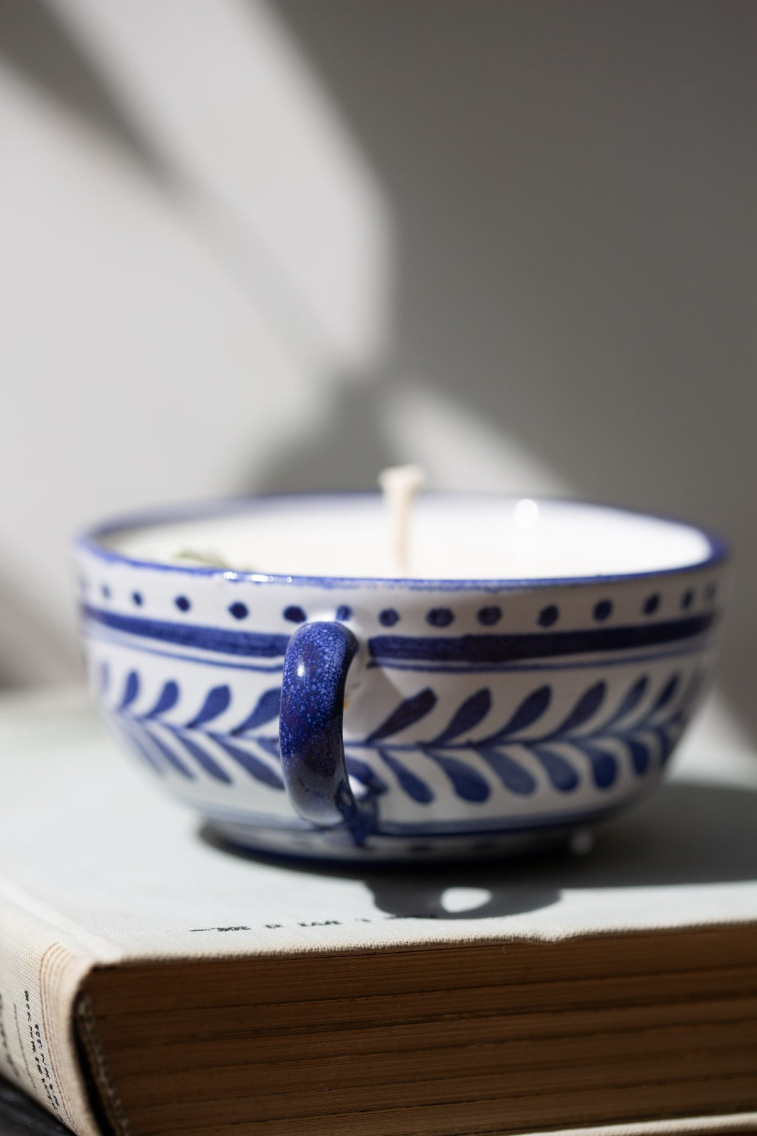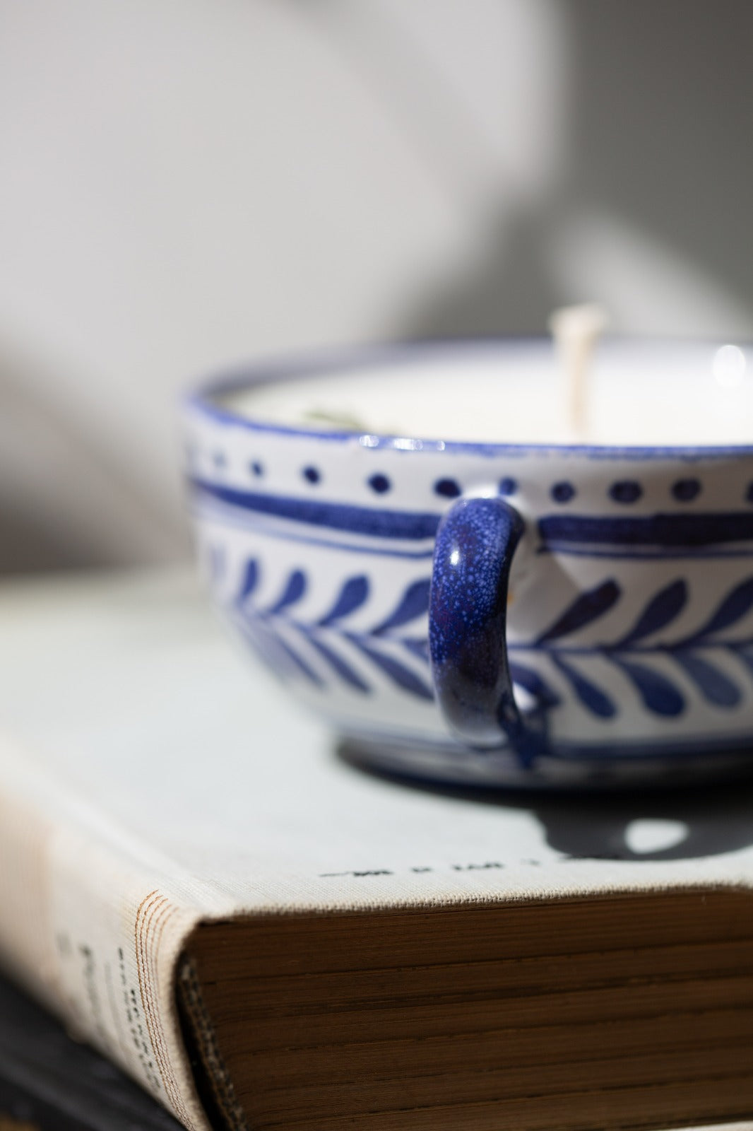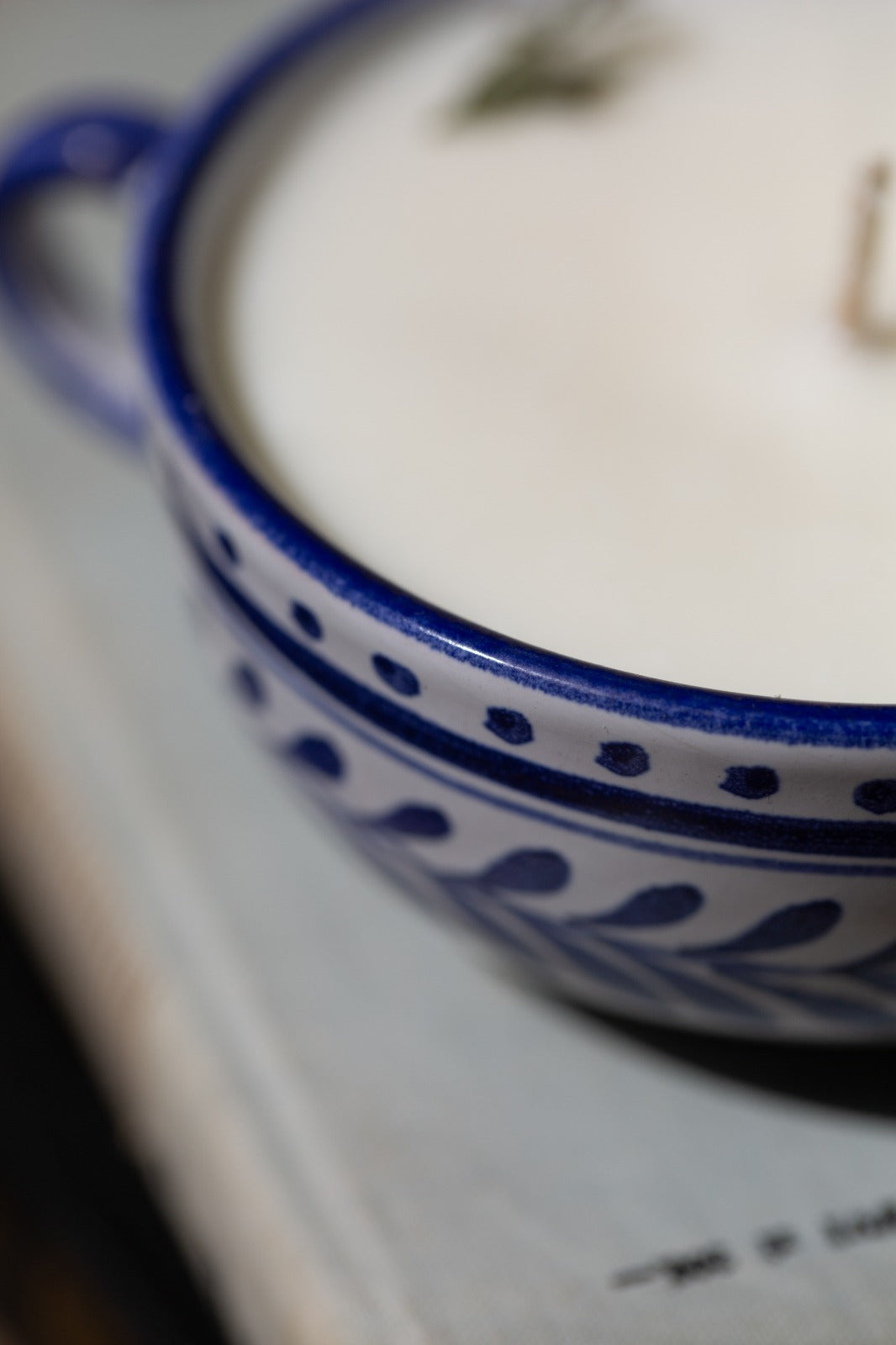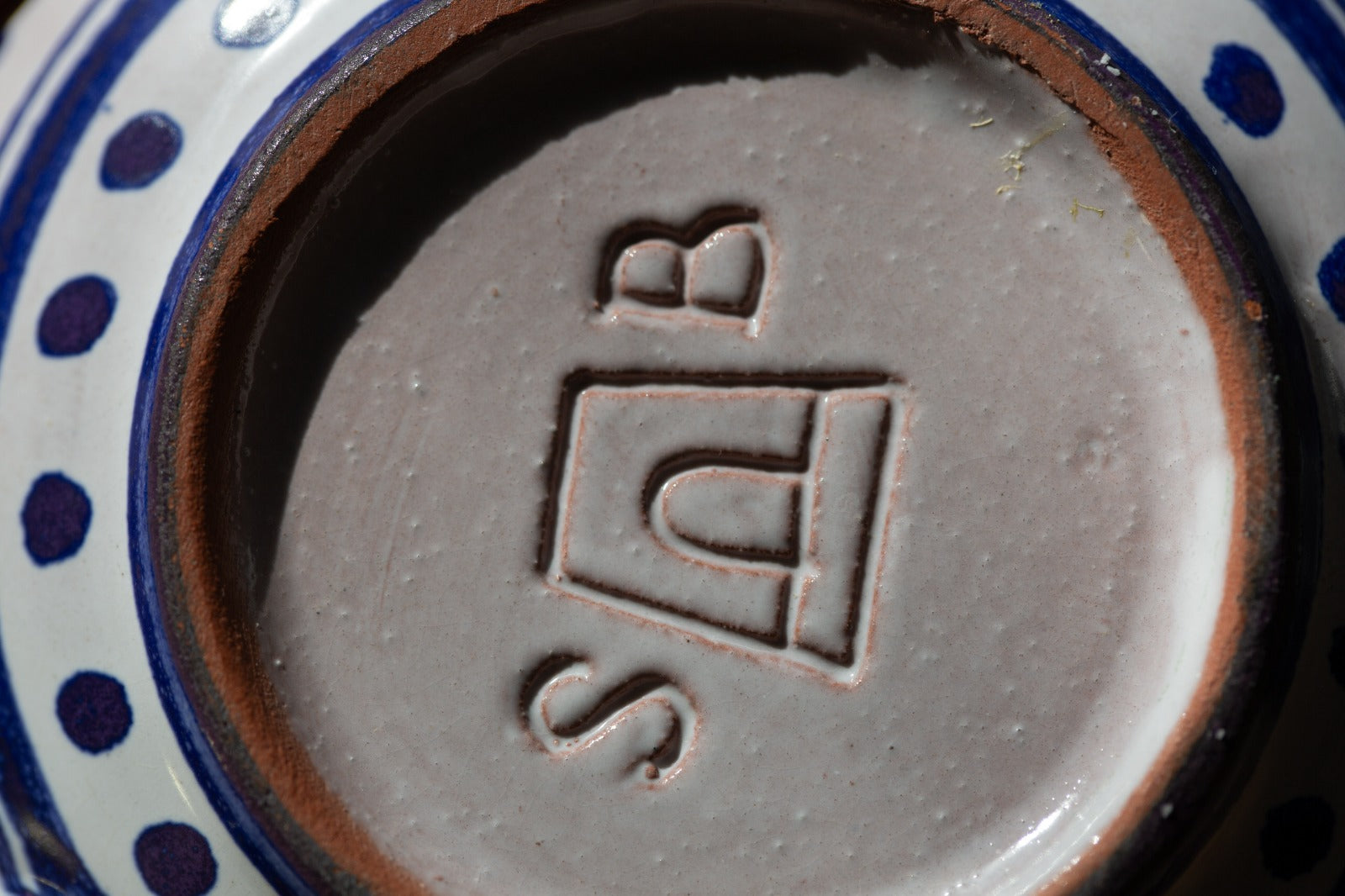 כוס מרק מקרמיקה בסגנון פולני מסורתי מבולסלאבייץ (Bolesławiec), פולין. סימן היצרן המוטבע בתחתית – מסגרת עם האותיות B ו-S ולעיתים כתר מעליהן – שייך לאחד מבתי המלאכה של קרמיקת Bunzlauer / Bolesławiec, אזור שלזיה בפולין הידוע בייצור קרמיקת סטונוור מאז המאה ה-19. העיטור הכחול בקובלט על רקע שמנת, הכולל נקודות וענפי עלים, הוא מאפיין טיפוסי של כלי בולסלאבייץ המעוטרים בטכניקת stamping ביד עם ספוגיות חותמת. הגוף עשוי חרס סטונוור עמיד שנשרף בטמפרטורה גבוהה ומזוגג בזיגוג שקוף. על-פי סגנון החותמת והעיטור, סביר לתארך את הייצור לסוף המאה ה-20, בערך שנות ה-80–90. במקור הכלי יועד ככל הנראה לקערת מרק או קערת תה עם ידית, כלי שימושי אופייני למטבח הפולני,