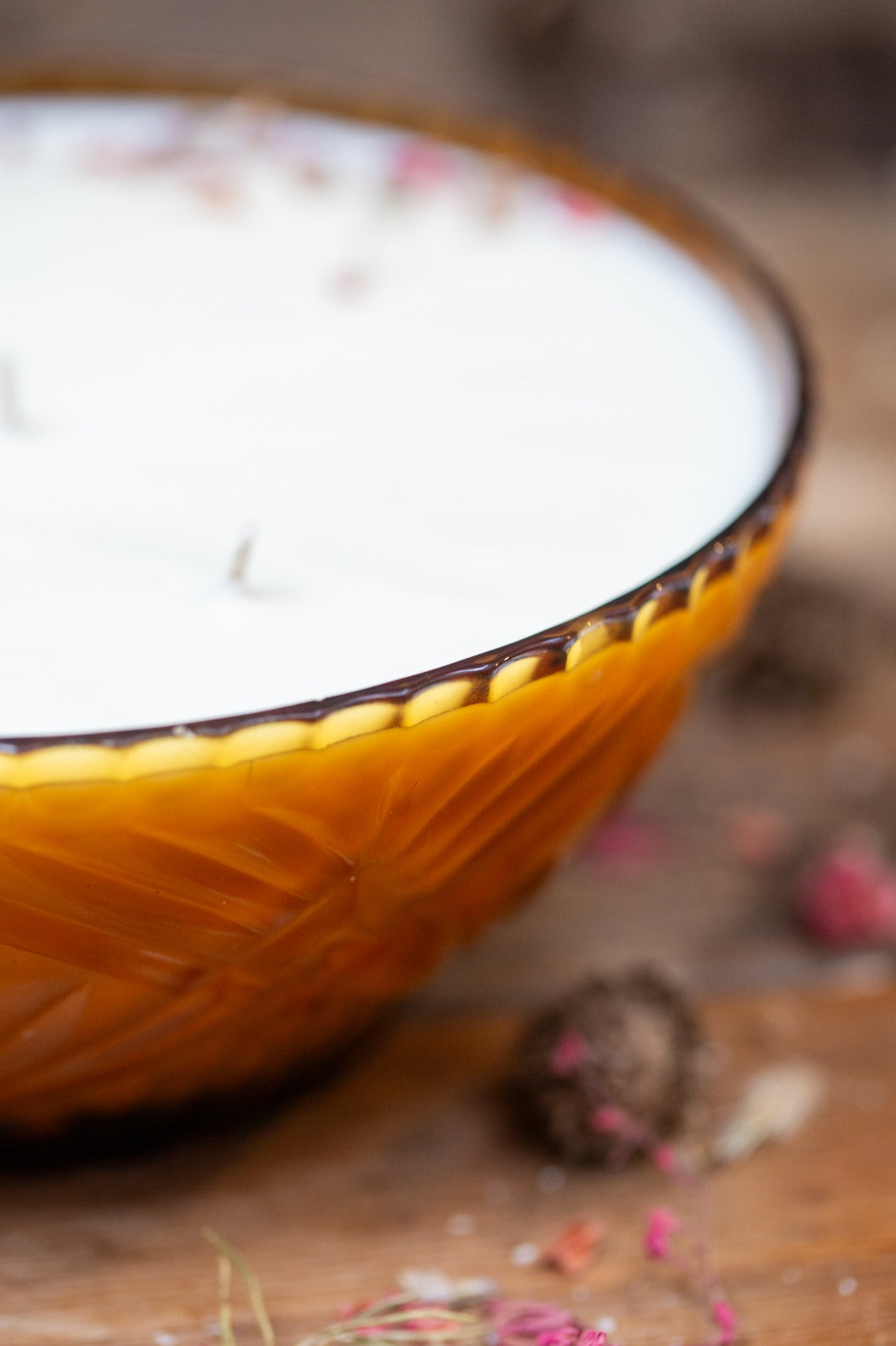 קערת זכוכית וינטג’ בצבע דבש־אמבר  מאיזור מזרח-אירופה (צ’כוסלובקיה/פולין), משנות ה־60–80. פאנלים אלכסוניים ו־Diamond/Criss-Cross לאורך הדפנות שיוצרים חיצים/שברונים (chevrons) – תמה נפוצה בזכוכית בוהמיינית/פולנית מאמצע המאה. שפה משוננת נמוכה ורכה המאפיינת קערות הגשה וסלט של אותה תקופה.