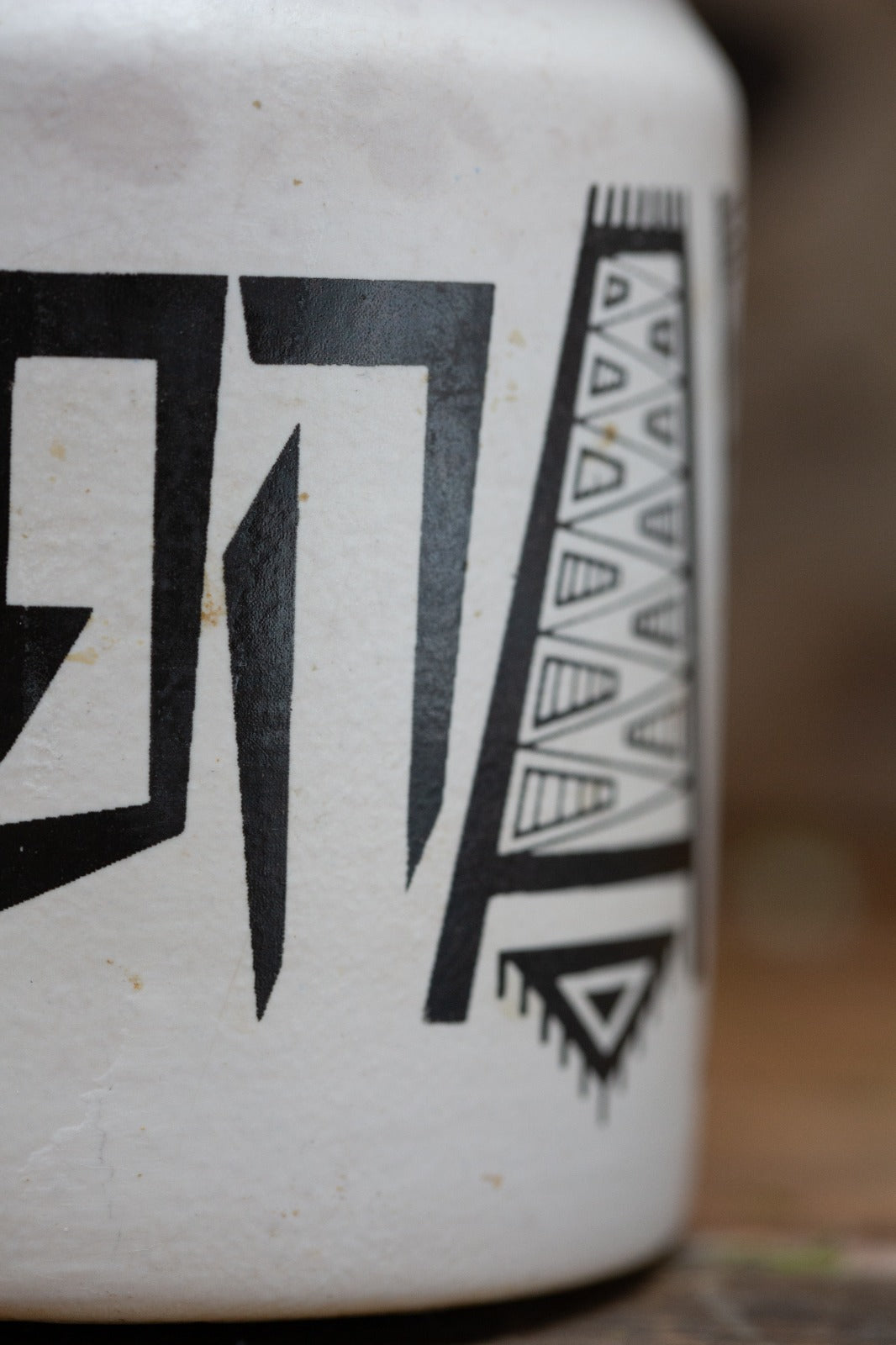 סגנון: הכלי מעוטר בעבודת יד בזיגוג אופייני בשחור ולבן, בעיצוב גאומטרי. האותיות במרכז הן בעברית – מאפיין נפוץ בקרמיקה הישראלית של התקופה, אשר הדגישה זהות מקומית ותרבות עברית.