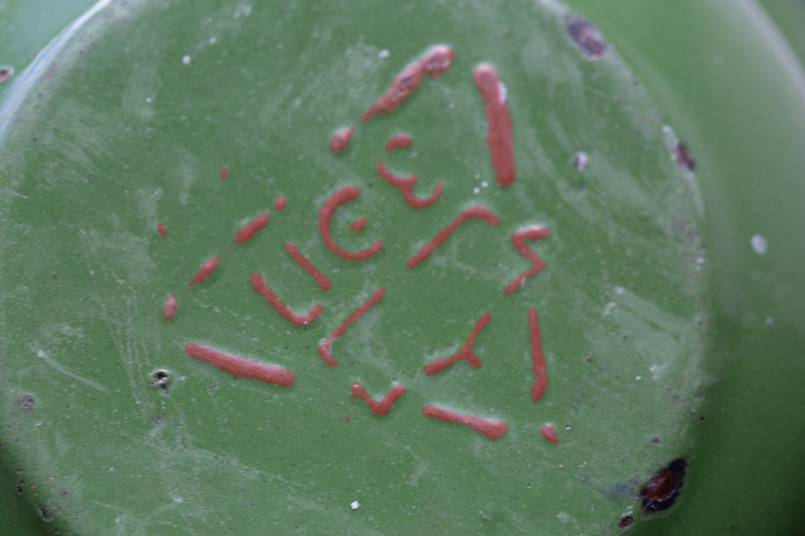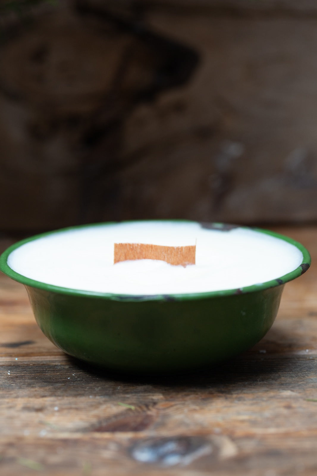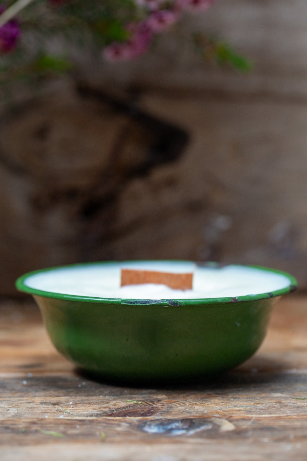 קערת אמייל וינטג’ אירופאית, שנות ה־60–70, בצבע ירוק עמוק, עם פטינה מקורית המעידה על חיי שימוש. כלי יומיומי פשוט שהפך לאובייקט מלא אופי ונוכחות.הכלי מייצג נאמנה את האסתטיקה התעשייתית-פונקציונלית של התקופה, ומשמש כיום פריט וינטג’ מבוקש.