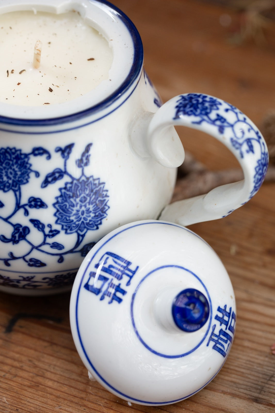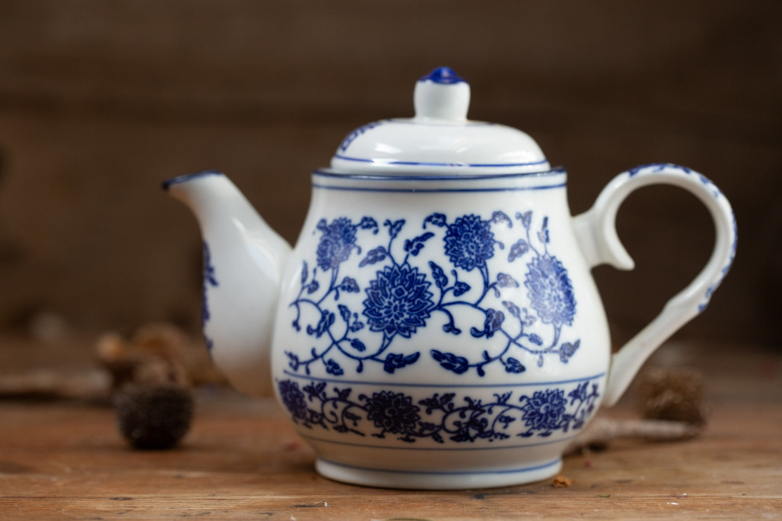 קומקום תה יפני קלאסי, עשוי פורצלן לבן עדין בעבודת יד, בעיטור כחול קובלט של פרחי כריזנתמה – סמל יפני לאצילות, שלווה ואריכות ימים.